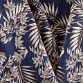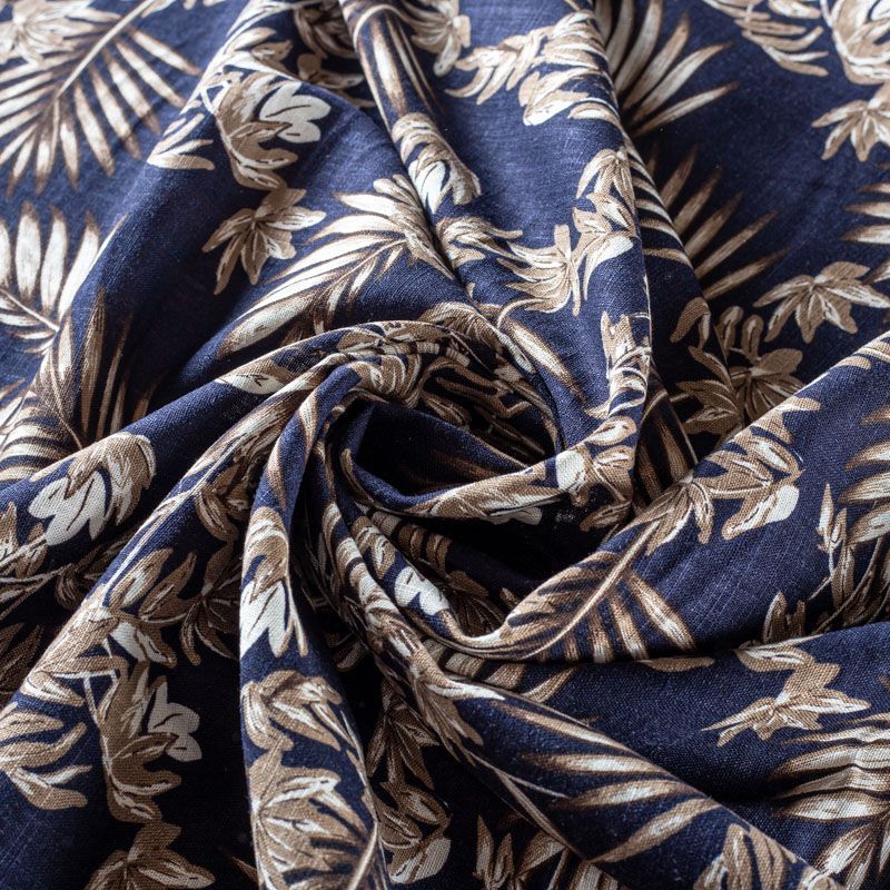 Льняная плательная ткань с добавлением вискозы темно-синего оттенка с растительным принтом. Материал прочный, с выразительной матовой рельефной поверхностью, полотняным плетением, хорошо держит форму, мягкий на ощупь, пластичный, отлично драпируется. Прекрасно подойдет для пошива летних платьев, сарафанов, юбок, рубашек, брюк и шорт.