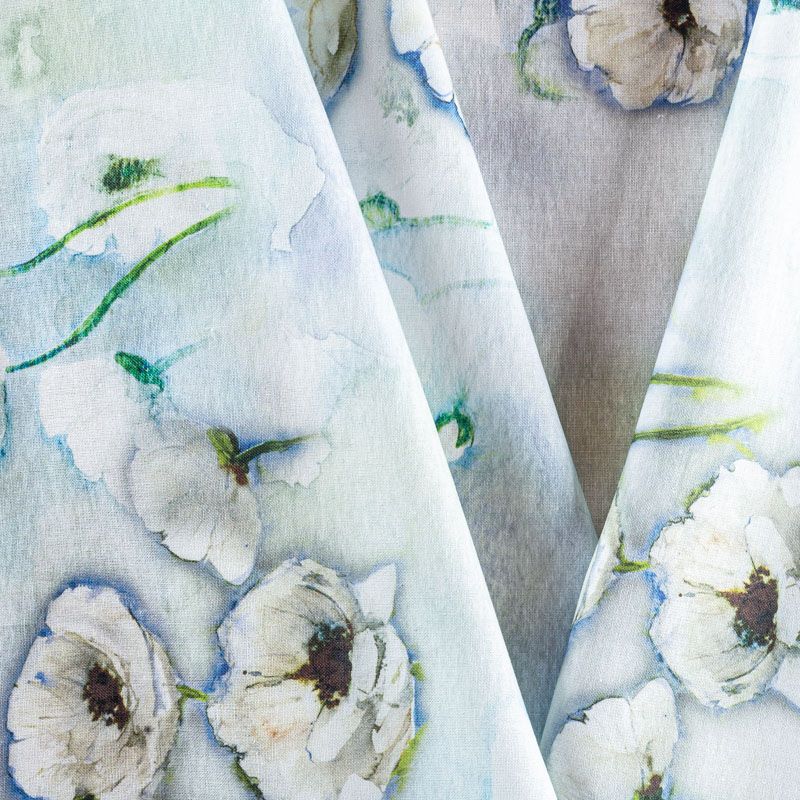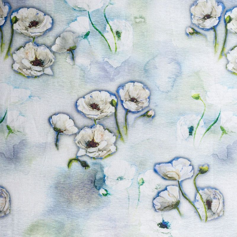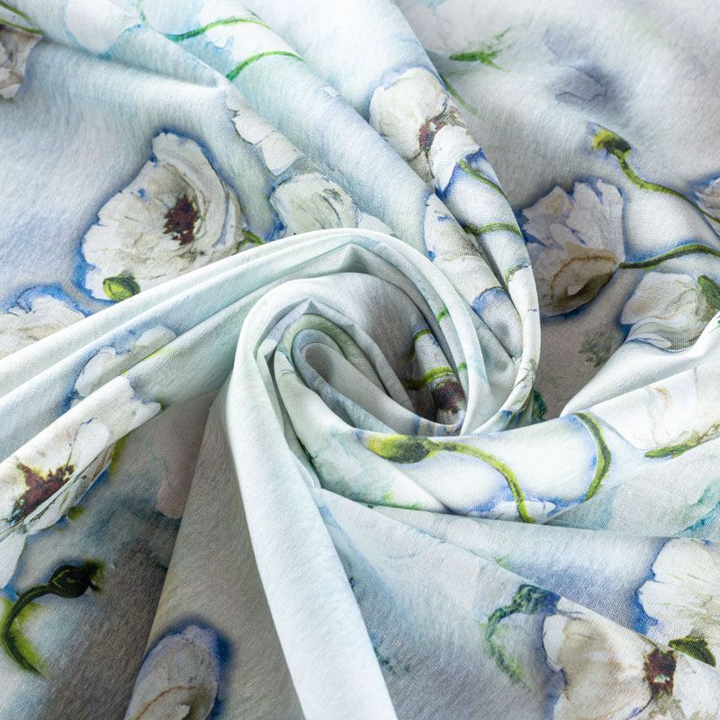 Льняная плательно-рубашечная ткань с добавлением бемерии выбеленного голубого оттенка с акварельными кувшинками. Материал прочный, с выразительной матовой рельефной поверхностью, полотняным плетением, хорошо держит форму, мягкий на ощупь, пластичный, отлично драпируется. Прекрасно подойдет для пошива летних платьев, сарафанов, юбок, рубашек, брюк и шорт.