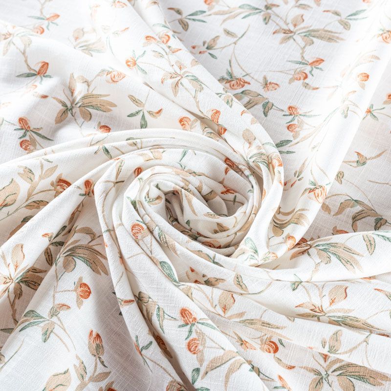 Льняная плательная ткань с добавлением вискозы белого цвета с милым цветочным принтом. Материал прочный, с выразительной матовой рельефной поверхностью, полотняным плетением, хорошо держит форму, мягкий на ощупь, пластичный, отлично драпируется. Прекрасно подойдет для пошива летних платьев, сарафанов, юбок, рубашек, брюк и шорт.