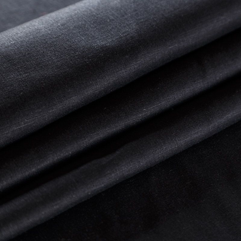 Плательно-рубашечный лен с добавлением вискозы и эластана в черном оттенке. Ткань прочная, имееет на ощупь приятную, гладкую поверхность, а визуально - выраженный рельеф и полотняное переплетение, плачтичная, хорошо драпируется. Подойдет для пошива широких брюк, шорт, рубашек, туники, юбок, платьев, сарафанов, топов, комбинезонов.