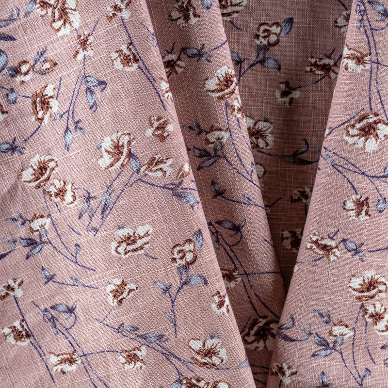 Прочный, выразительная матовая рельефная поверхность, полотняное переплетение, хорошо держит форму, мягкий на ощупь, пластичный, отлично драпируется. Прекрасно подойдет для пошива летних платьев, сарафанов, юбок, рубашек, брюк и шорт. Льняная плательная ткань с мелким цветочным принтом.