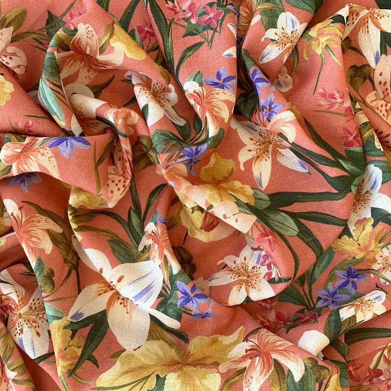 Прочный, выразительная матовая рельефная поверхность, полотняное переплетение, хорошо держит форму, мягкий на ощупь, пластичный, отлично драпируется, тянется. Прекрасно подойдет для пошива летних платьев, сарафанов, юбок, рубашек, брюк и шорт. Льняная плательная ткань с изображением соцветий ярких лилий на благородном коралловом фоне.