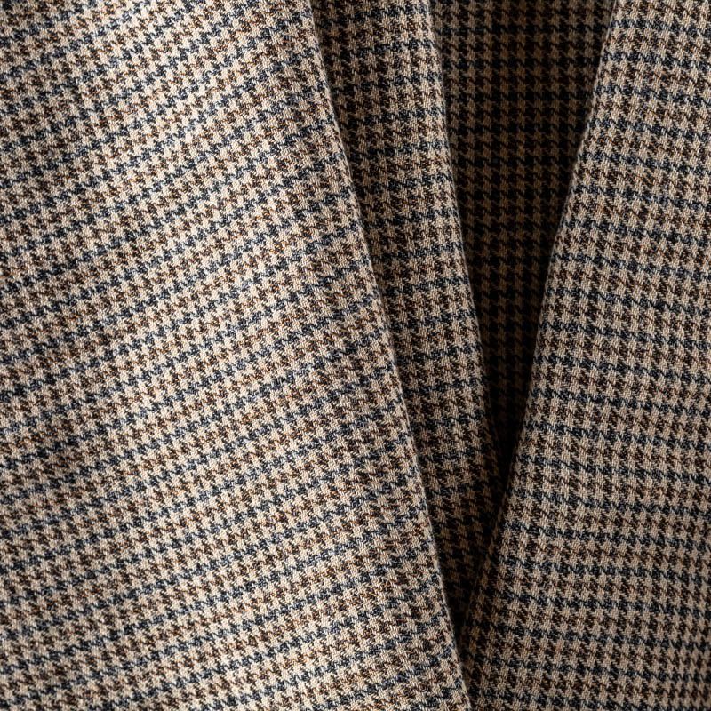 Прочный и плотный, выразительная матовая рельефная поверхность, полотняное переплетение, отлично держит форму, жестковатый на ощупь, но комфортный в изделии. Стильный вариант для летних пальто, платьев-футляров, сарафанов, юбок, жакетов, брюк или шорт. Льняная костюмно-плательная ткань с мелким принтом "гусиная лапка" в классических коричнево-синих тонах.