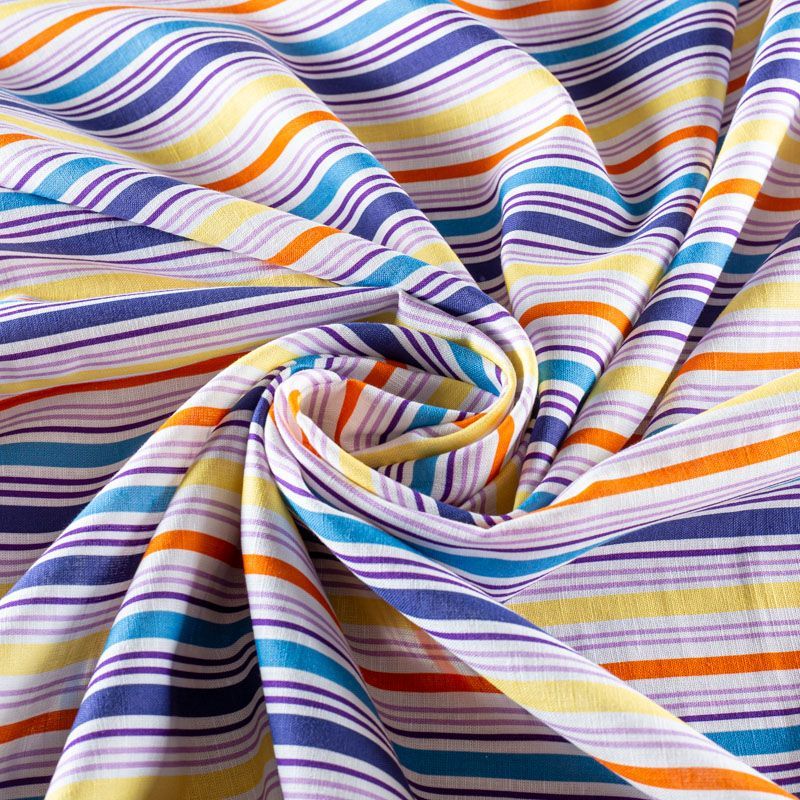 Итальянский лен с добавлением вискозы средней плотности с принтом в разноцветную вертикальную полоску. Ткань прочная, имееет выразительную матовую рельефную поверхность и полотняное переплетение, хорошо держит форму. Подойдет для пошива весенне-летних костюмов, платьев, брюк, шорт, топов, сарафанов.