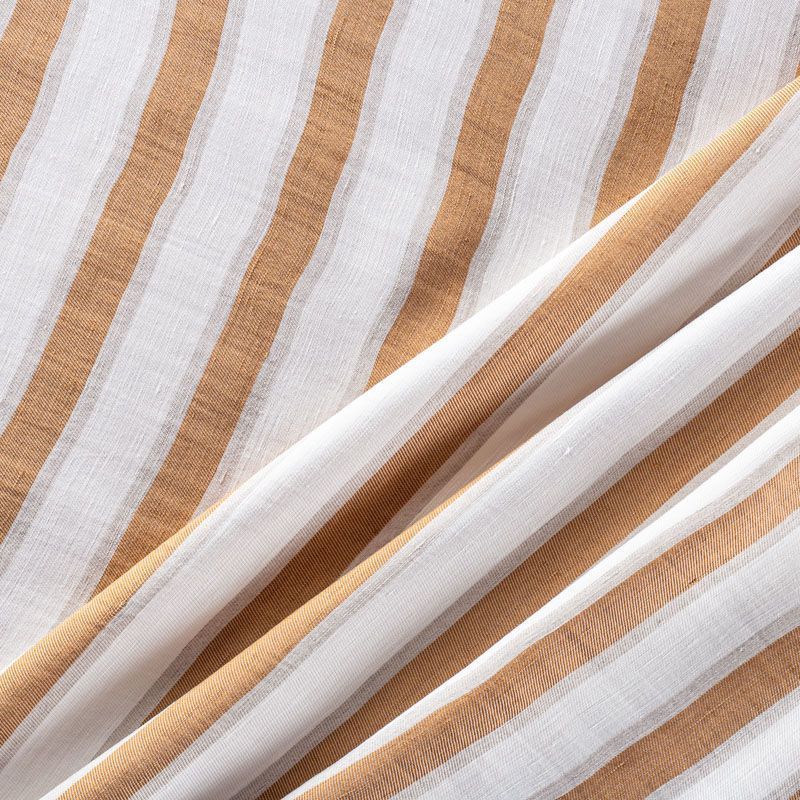 Итальянский плательно-рубашечный лен с добавлением вискозы, средней плотности, в полоску бежевых оттенков. Рисунок расположен перпердикулярно кромке. Ткань прочная, имееет выразительную матовую рельефную поверхность и полотняное переплетение, хорошо держит форму. Подойдет для пошива весенне-летних костюмов, платьев, брюк, шорт, топов, сарафанов.
