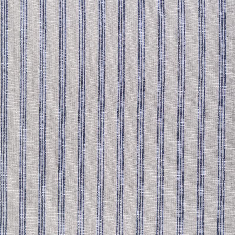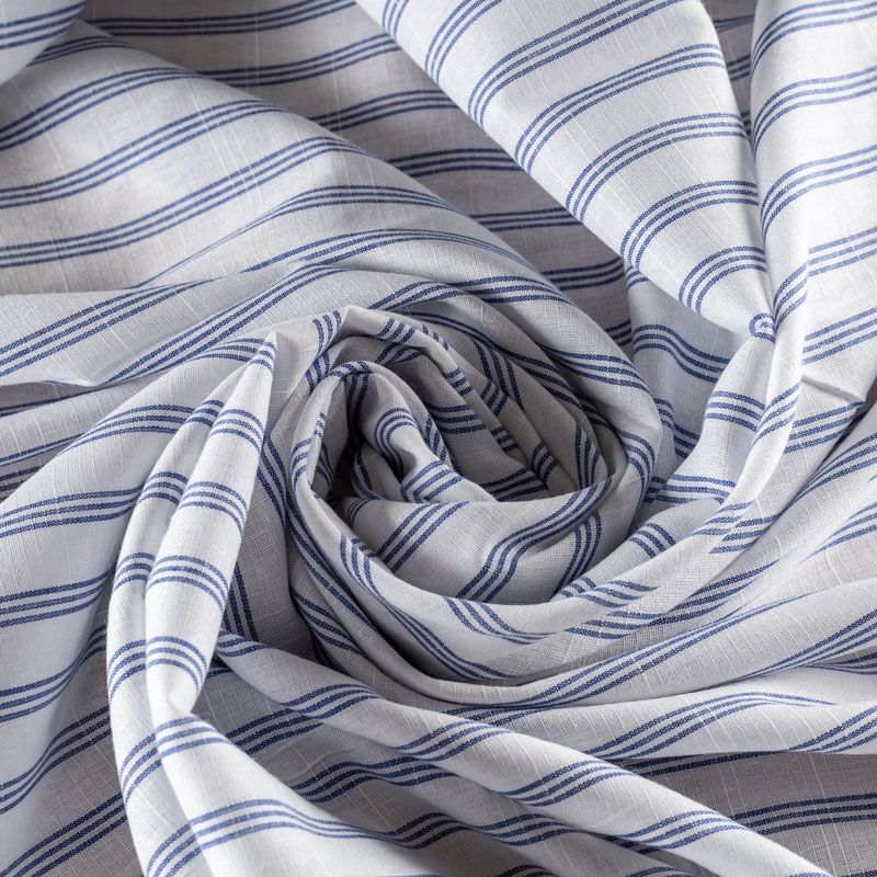 Ткань лёгкая, непрозрачная, поверхность матовая имеет льняную текстуру, приятная к телу, хорошо драпируется. По назначению - для юбки, платья-рубашки, сарафана, туники. На белом фоне тройная тонкая полоска темно-синего цвета расположена вдоль кромки.