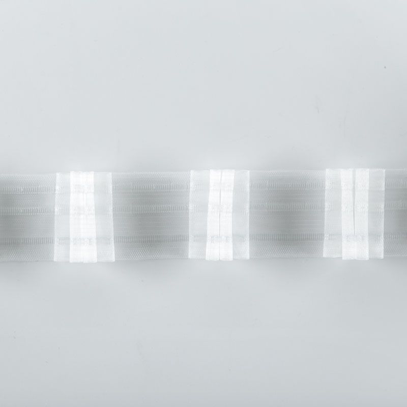 Шторная лента полностью прозрачная для тюлей и портьерных тканей с 4-ой бантовой складкой. Сокращение - 1:3, раппорт - 24 см, расстояние между складками - 8 см, 2 ряда кармашков, крепление - крючки.