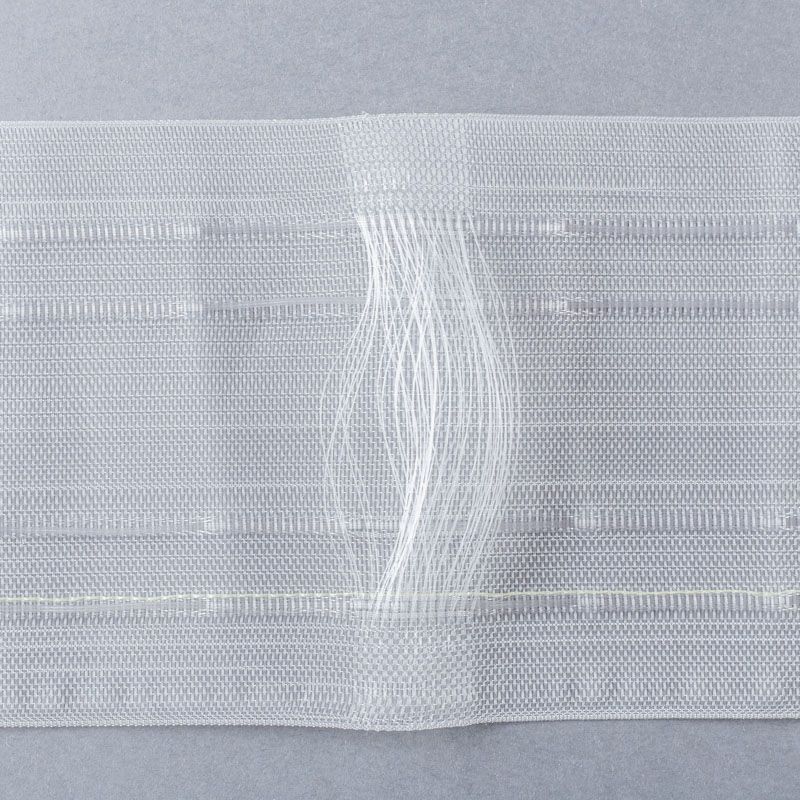 Шторная лента полностью прозрачная для тюлей и легких портьерных тканей с вафельной сборкой. Сокращение - 1:2,5, раппорт - 28 см, 2 ряда кармашков, крепление - крючки.