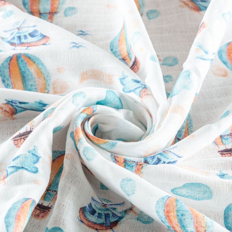 Хлопковый муслин полотняного переплетения, в котором нити утка и основы перекрывают друг друга на больших промежутках, поэтому ткань очень мягкая, легкая, частично прозрачная. Муслин используется для пошива подгузников, пелёнок, комплектов постельного белья для взрослых и детей, занавесок и пологов для детских кроваток, а также одежды.