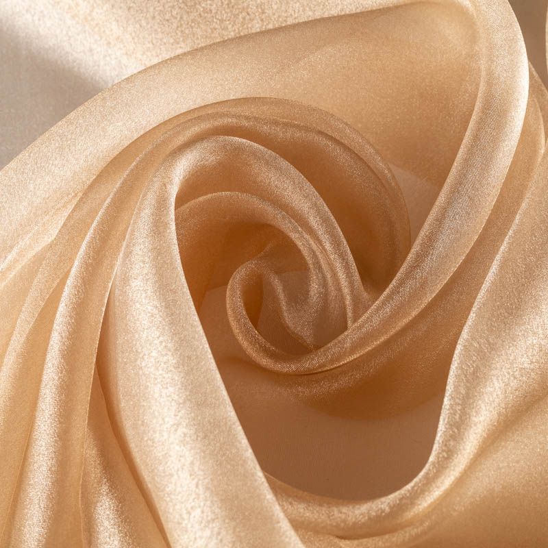 Легчайший, прозрачный, но не рыхлый материал с искрящейся переливчатой поверхностью. Изящный и воздушный, не деформируется, прекрасно держит форму и драпируется. Подойдет для пошива платья или блузы свободного силуэта на подкладе, а также для декора.