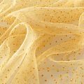 Легчайший, изящный, воздушнный и прозрачный материал с благородной переливчатой поверхностью. Прекрасно держит форму в заложеных складках. На лицевой стороне объемные декоративные элементы из флока диаметром 0.5 см. Подойдет для создания в изделии декоративных деталей, новогодних костюмов, нарядных платьев, блузок.