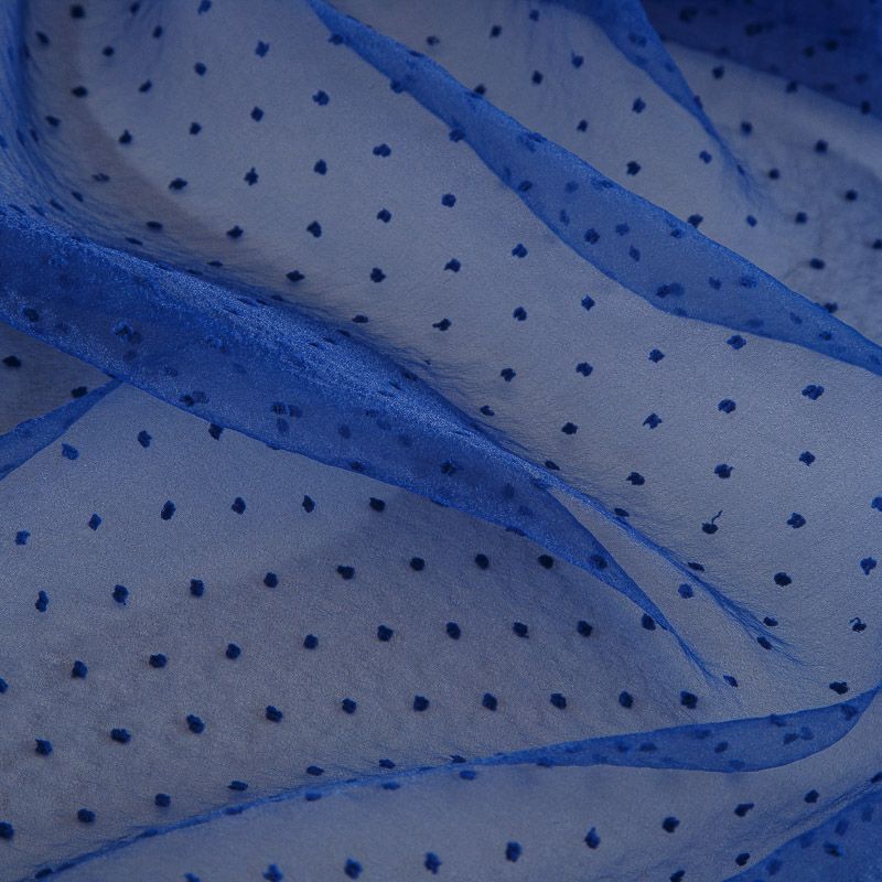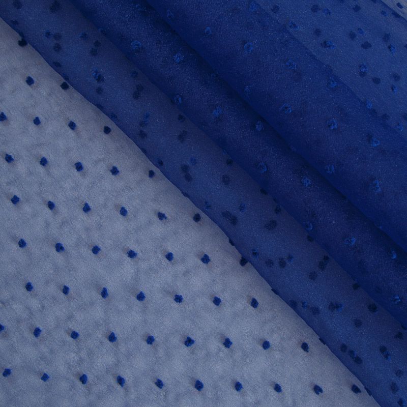 Легчайший, изящный, воздушнный и прозрачный материал с благородной переливчатой поверхностью. Прекрасно держит форму в заложеных складках. На лицевой стороне объемные декоративные элементы из флока диаметром 0.5 см. Подойдет для создания в изделии декоративных деталей, новогодних костюмов, нарядных платьев, блузок.
