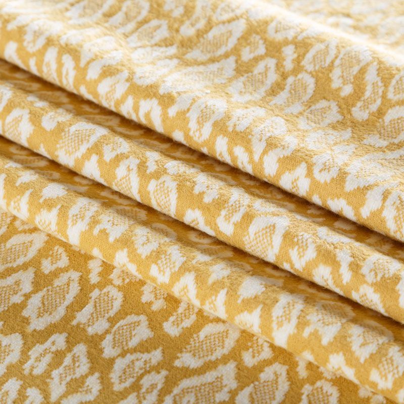 Плотный двухслойный пальтовый трикотаж желтого оттенка со стилизованным анималистическим узором белого цвета. Ткань очень приятная на ощупь, пластичная, теплая и уютная, поверхность мягкая и шелковистая. Изнанка однотонная молочного оттенка. Прекрасно подойдет для пошива пальто, теплых жакетов, курток, кардиганов, костюмов.