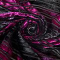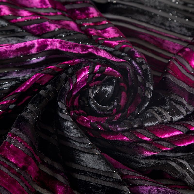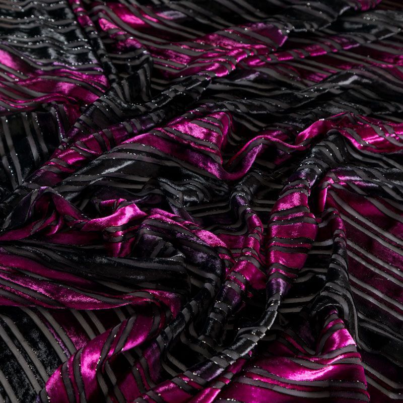 Итальянская шелковая красивая и эффектная ткань с гладким, немного глянцевым ворсовым узором на матовой шифоновой основе черного цвета. Панбархат тонкий, но объемный за счет рельефности рисунка, при драпировке ложится мягкими струящимися складками. Отлично подойдет для пошива блузы, туники, платья, костюма в пижамном стиле.