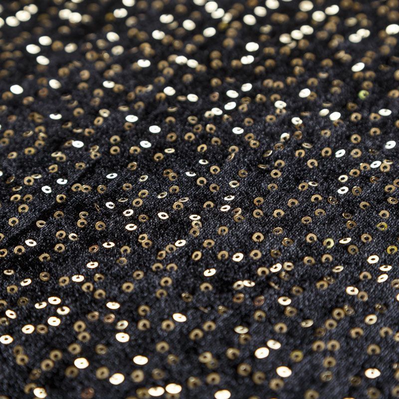 Роскошкный черный бархат с мелкими блестящими пайетками золотистого цвета. Необычное сочетание фактур и итальянское качество делают эту ткань яркой и нарядной. Она очень эластичная, мягкая и пластичная, красиво драпируется и ниспадает. Пайетки отлично подойдут для вечеринок, праздничных вечеров, корпоративов и других мероприятий в качестве платья, брюк, шорт, юбки, жакета, боди, топа, туники или комбинезона.