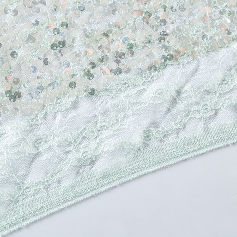 Итальянское ажурное кружевное полотно мятного оттенка с цветочным рисунком и нашитыми на него прозрачными глянцевыми пайетками с лицевой стороны. Ткань полупрозрачная, требуется подклад. Очень мягкая и пластичная, эффектно переливается при движении, хорошо драпируется. Пайетки — идеальный материал для праздников и вечеринок. Из них получится эффектное платье, туника, топ, юбка или комбинезон.