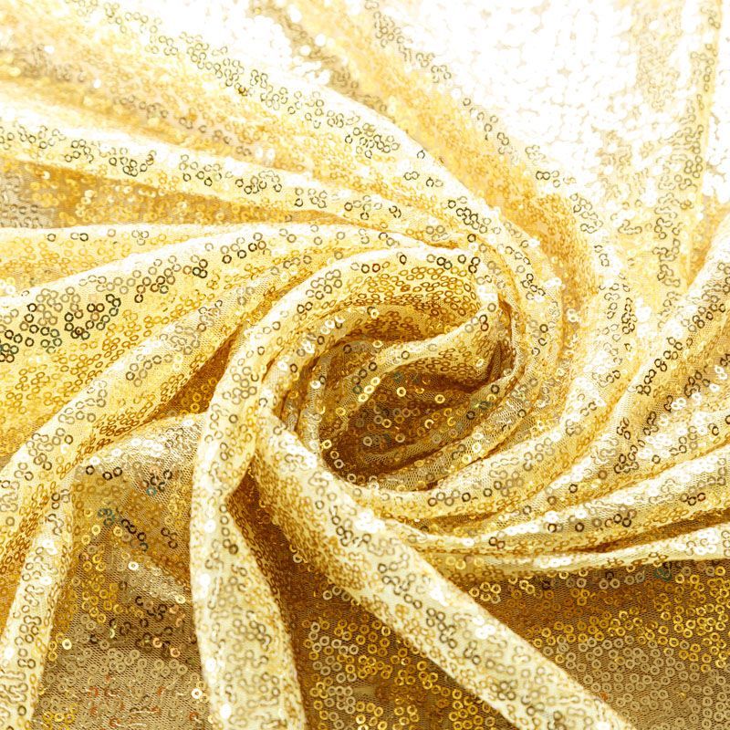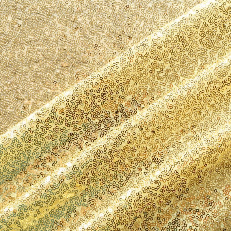 Блестящие пайетки в золотистом оттенке. Мелкие, размером около 3 мм, расположены в хаотичном порядке. Основа - мягкая и эластичная сетка. Ткань полупрозрачная, может потребоваться подклад. Подойдет для вечернего, коктейльного платья, юбки, нарядных детских изделий, танцевальных и сценических костюмов.