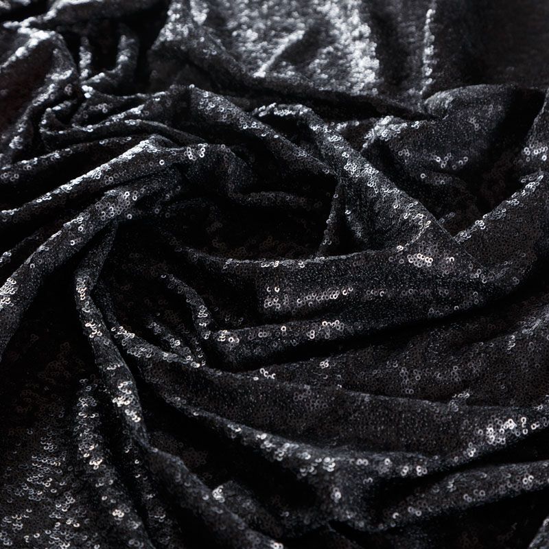 Тонкая эластичная сетка черного цвета по всей поверхности усеяна мелкими полуматовыми пайетками в тон основе. Ткань очень хорошо драпируется, красиво переливается, пластичная и эластичная и в длину, и в ширину, благодаря чему изделия получаются комфортными и отлично сидят по фигуре. Пайетки — идеальный материал для праздников и вечеринок. Из них получится эффектное платье, жакет, боди, топ, туника, юбка или комбинезон.