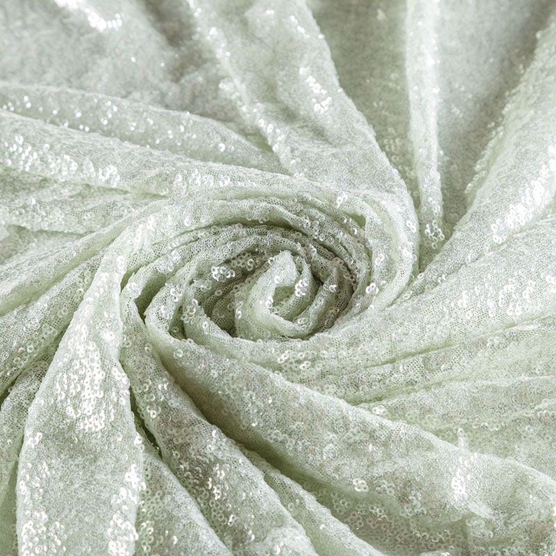 Тонкая эластичная сетка светло-зеленого оттенка по всей поверхности усеяна мелкими прозрачными глянцевыми пайетками. Ткань очень хорошо драпируется, красиво переливается, имеет глянцевый блеск, пластичная и эластичная и в длину, и в ширину. Пайетки — идеальный материал для праздников и вечеринок. Из них получится эффектное платье, жакет, боди, топ, туника, юбка или комбинезон.