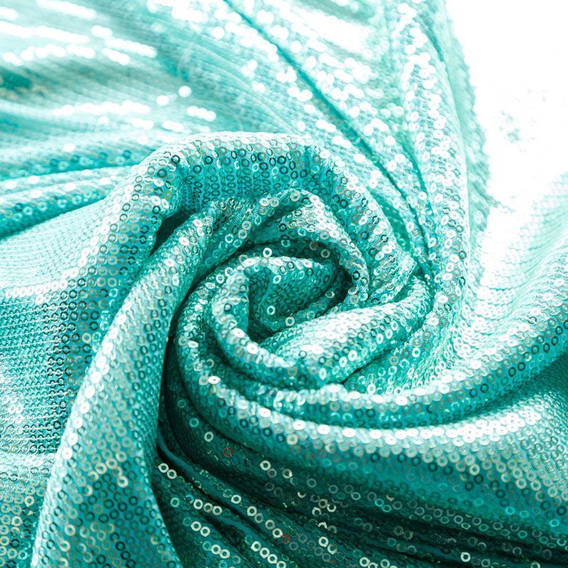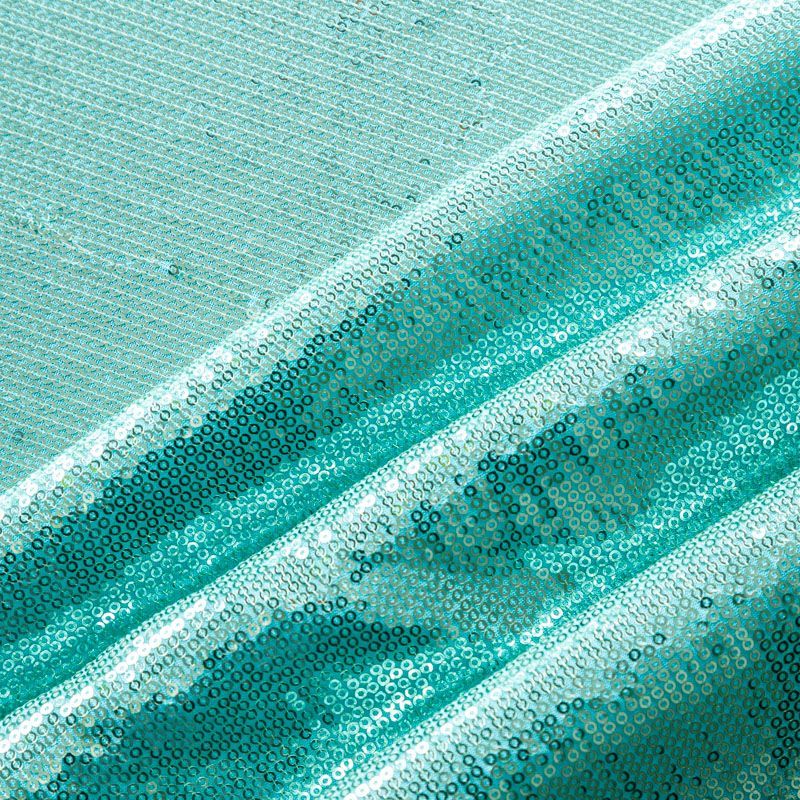 Блестящие пайетки в бирюзовом оттенке. Мелкие, размером около 3 мм, расположены в хаотичном порядке. Основа - мягкая и эластичная сетка. Ткань полупрозрачная, может потребоваться подклад. Подойдет для вечернего, коктейльного платья, юбки, нарядных детских изделий, танцевальных и сценических костюмов.