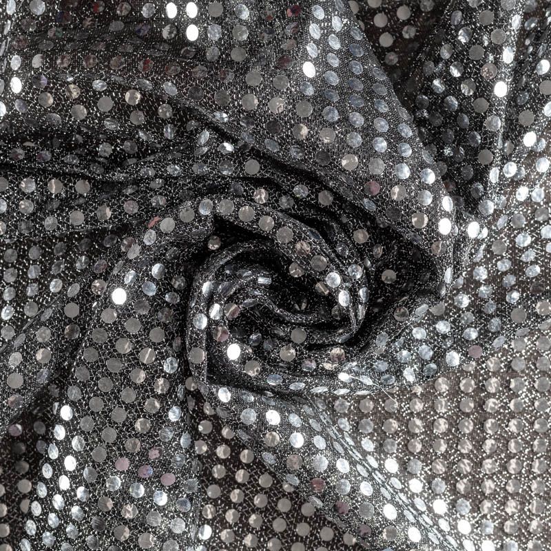 Полупрозрачный переливающийся материал, основа которого, из тонкого сетчатого трикотажа с люрексом. Полотно усеяно блестящими зеркальными круглыми пайетками диаметром 6 мм. Ткань идеально подойдет для декорирования элементов костюма, пошива вечерних нарядов, концертных и танцевальных костюмов.