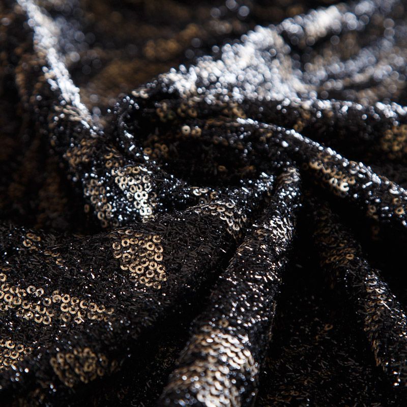 Итальянские пайетки на трикотажной основе с люрексовой нитью с абстрактным черно-золотым принтом. Полотно не много рыхлое, пластичное, тянется, не просвечивает, хорошо драпируется. Подойдет для пошива платьев, юбки, комбинезона, топа, лонгслива, боди.