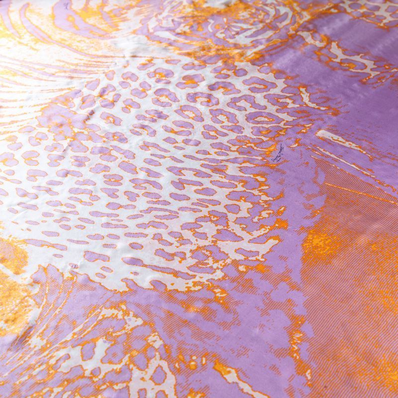 Изящный, нежный и необыкновенный шарф из итальянского шелкового шифона с крупным анималистичным принтом "зебра" в ярких оранжевых и фиолетовых тонах на молочном фоне. Невесомый, воздушный, мягкий и пластичный, летящий, поверхность с красивым матовым блеском. Будет отличным стильным аксессуаром к платью, костюму, пальто, жакету.