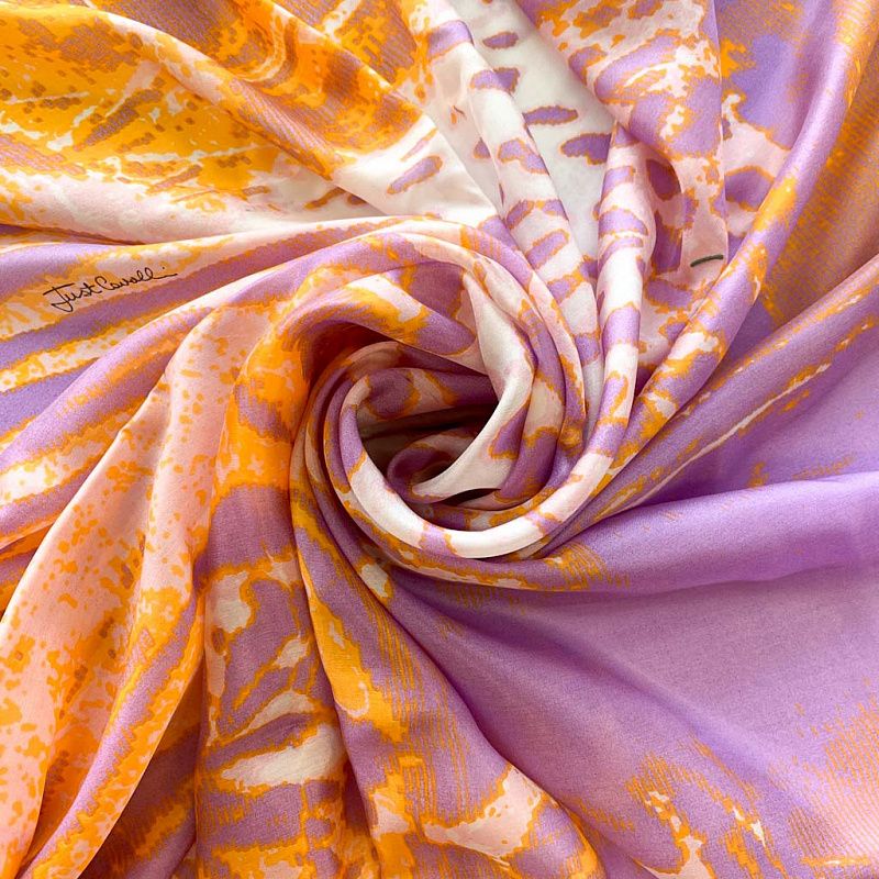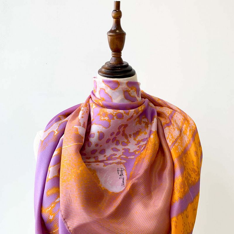 Изящный, нежный и необыкновенный шарф из итальянского шелкового шифона с крупным анималистичным принтом "зебра" в ярких оранжевых и фиолетовых тонах на молочном фоне. Невесомый, воздушный, мягкий и пластичный, летящий, поверхность с красивым матовым блеском. Будет отличным стильным аксессуаром к платью, костюму, пальто, жакету.