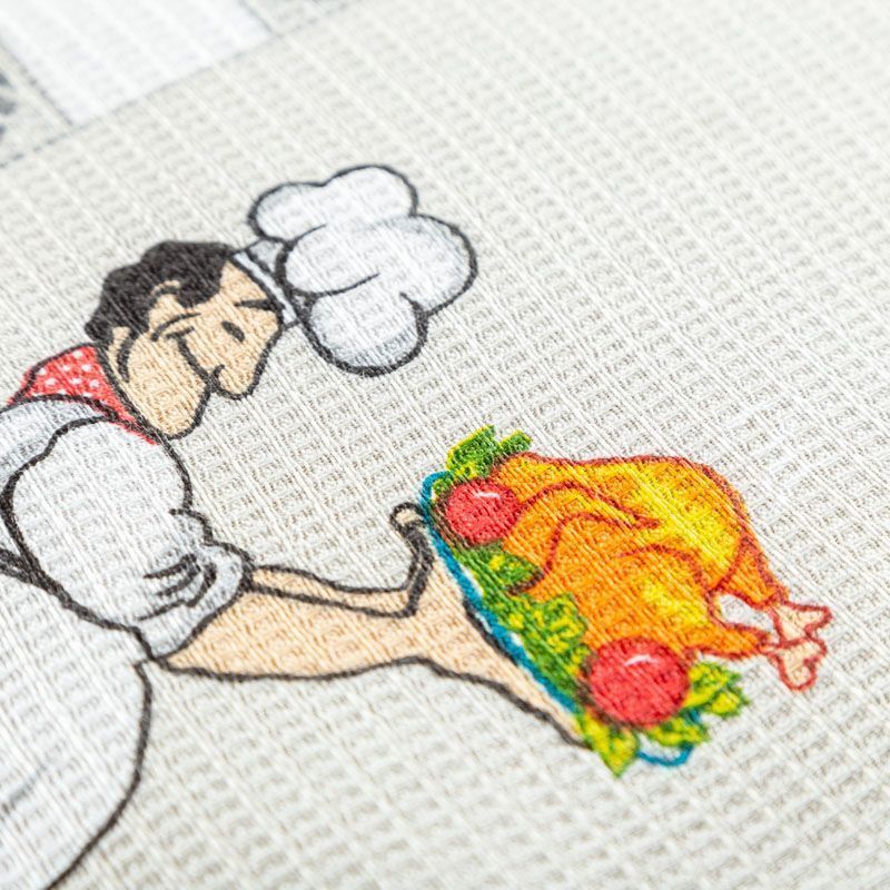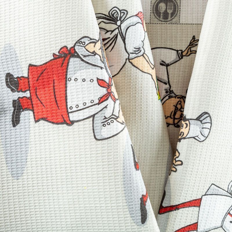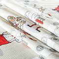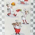 Качественная натуральная хлопчатобумажная ткань, обладающая высокой гигроскопичностью, с милыми поваренками на светло-сером фоне. Универсальный материал, из которого  шьют кухонные полотенца, скатерти, прихватки, салфетки.