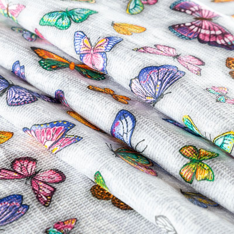 Качественная натуральная хлопчатобумажная ткань, обладающая высокой гигроскопичностью, с яркими бабочками на светло-сером фоне. Универсальный материал, из которого шьют кухонные полотенца, скатерти, прихватки, салфетки.