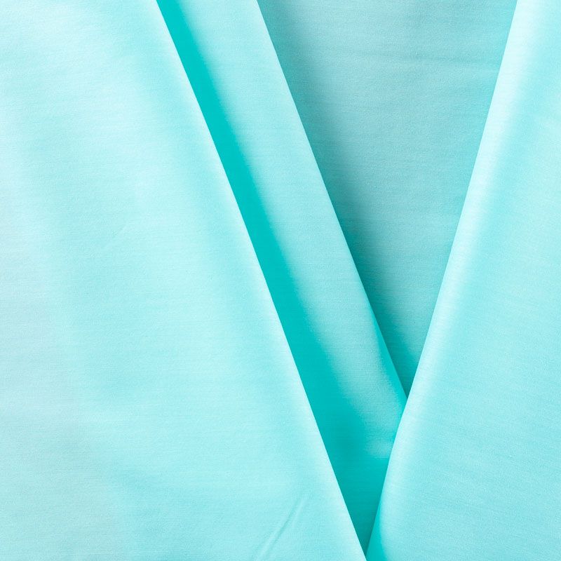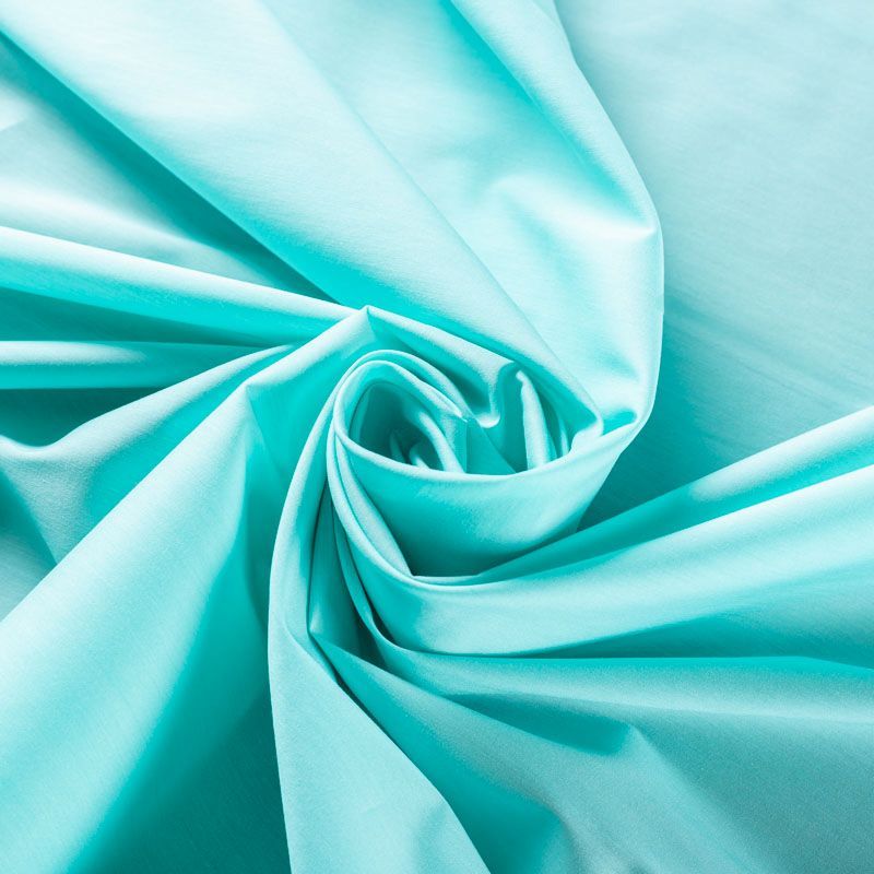 Однотонный плательно-рубашечный хлопковый поплин бирюзового оттенка. Ткань лёгкая, слегка прозрачная, поверхность матовая, гладкая, приятная к телу, хорошо драпируется, тянется за счет эластана в составе. Прекрасно подойдет блузы, платья-рубашки, летнего сарафана, туники.