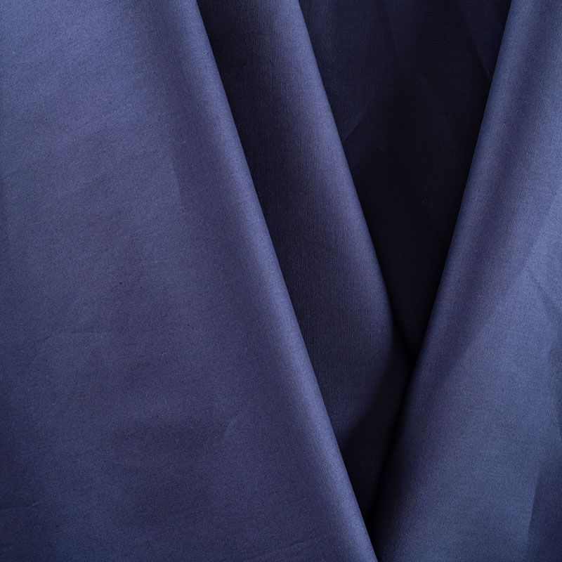 Однотонный плательно-рубашечный хлопковый поплин темно-синего оттенка. Ткань лёгкая, слегка прозрачная, поверхность матовая, гладкая, приятная к телу, хорошо драпируется, тянется за счет эластана в составе. Прекрасно подойдет блузы, платья-рубашки, летнего сарафана, туники.