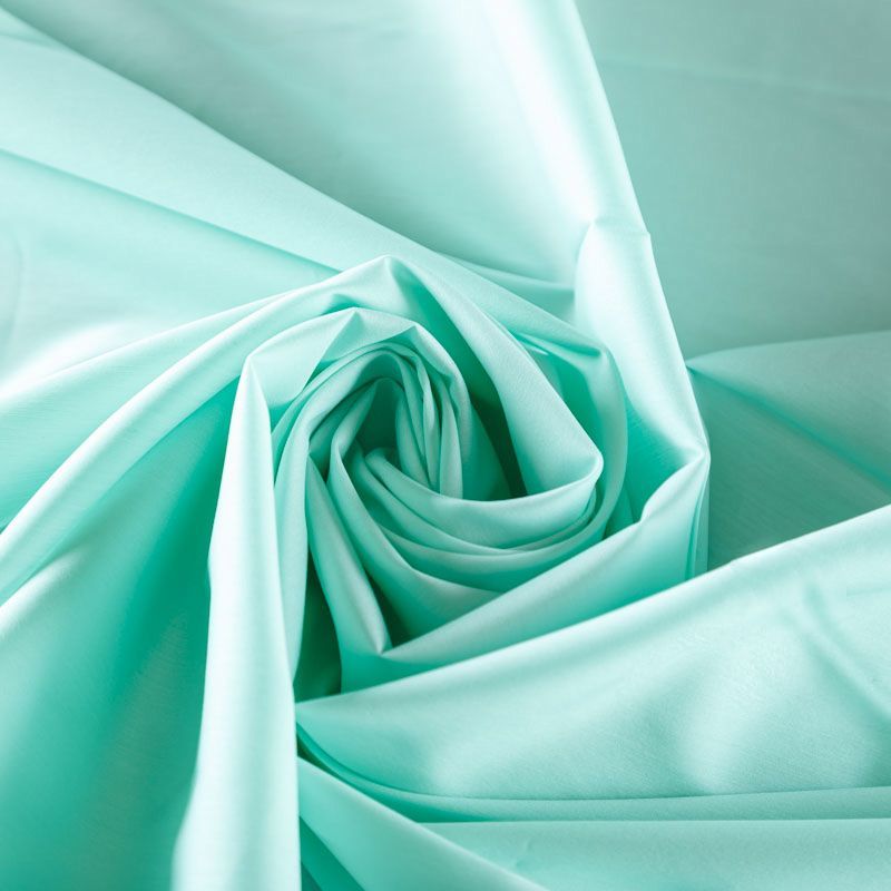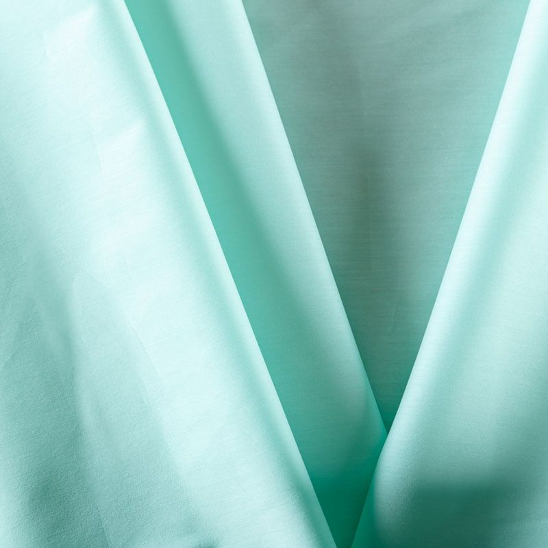 Однотонный плательно-рубашечный смесовый поплин мятного оттенка. Ткань лёгкая, слегка прозрачная, поверхность матовая, гладкая, приятная к телу, хорошо драпируется, тянется за счет эластана в составе. Прекрасно подойдет блузы, платья-рубашки, летнего сарафана, туники.