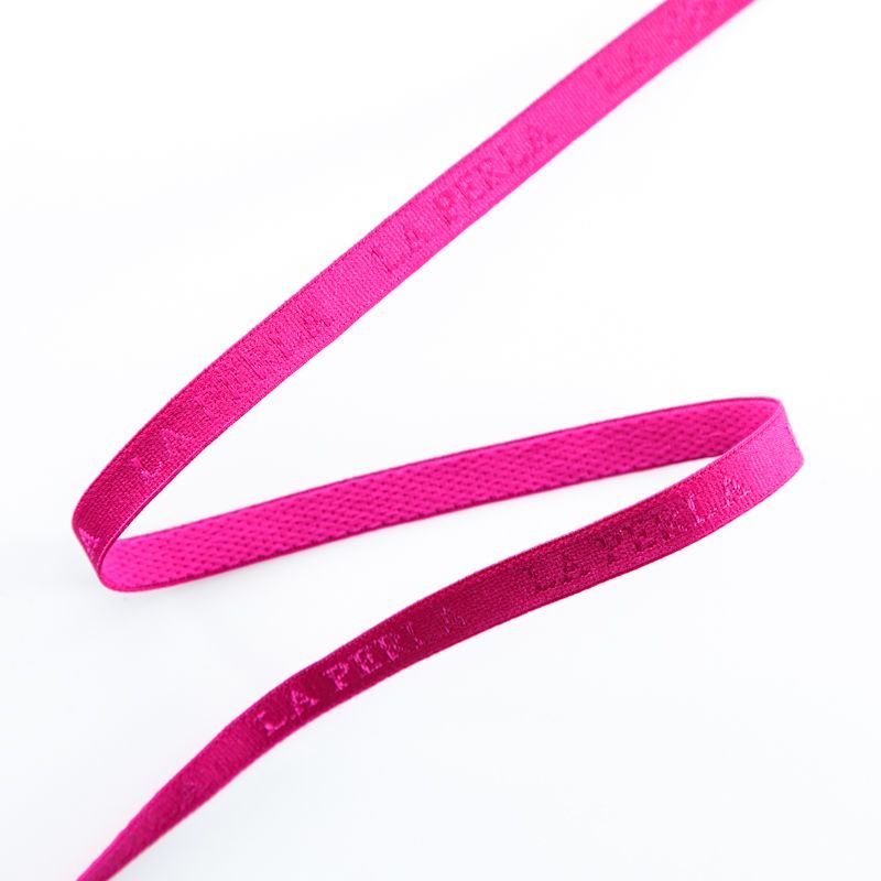 Бретелечная резинка используется для обработки стана бюстгальтера, а также для бретелей. Матовая с жаккардовой надписью бренда. Края ровные.