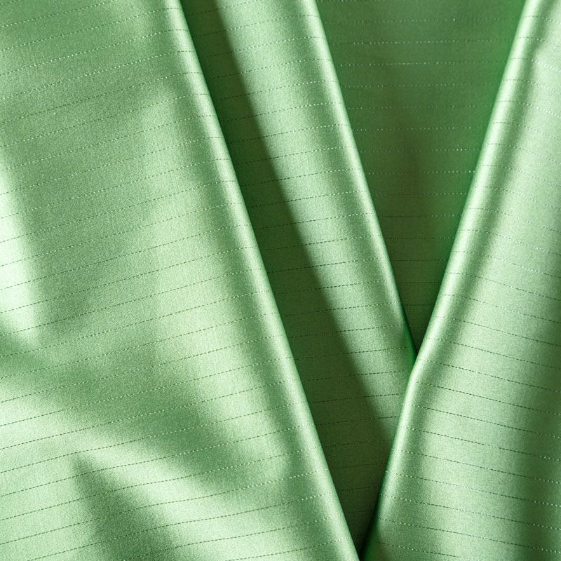 Сатин-коттон в зеленом оттенке с тонкими полосками люрексовой нити. Поверхность гладкая со сдержанным блеском, ткань средней плотности,  не толстая, хорошо держит форму, тянется за счет эластана в составе. Подойдет для пошива костюма, жакета, юбки, платья, брюк или шорт.