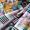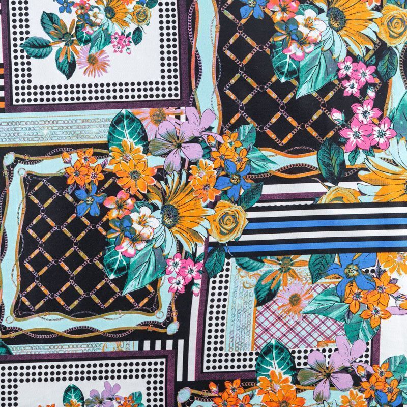 Сатин-коттон в мятном цвете с абстрактно-цветочным принтом. Поверхность гладкая со сдержанным блеском, ткань средней плотности, не толстая, хорошо держит форму, тянется за счет эластана в составе. Подойдет для пошива костюма, жакета, юбки, платья, брюк или шорт.