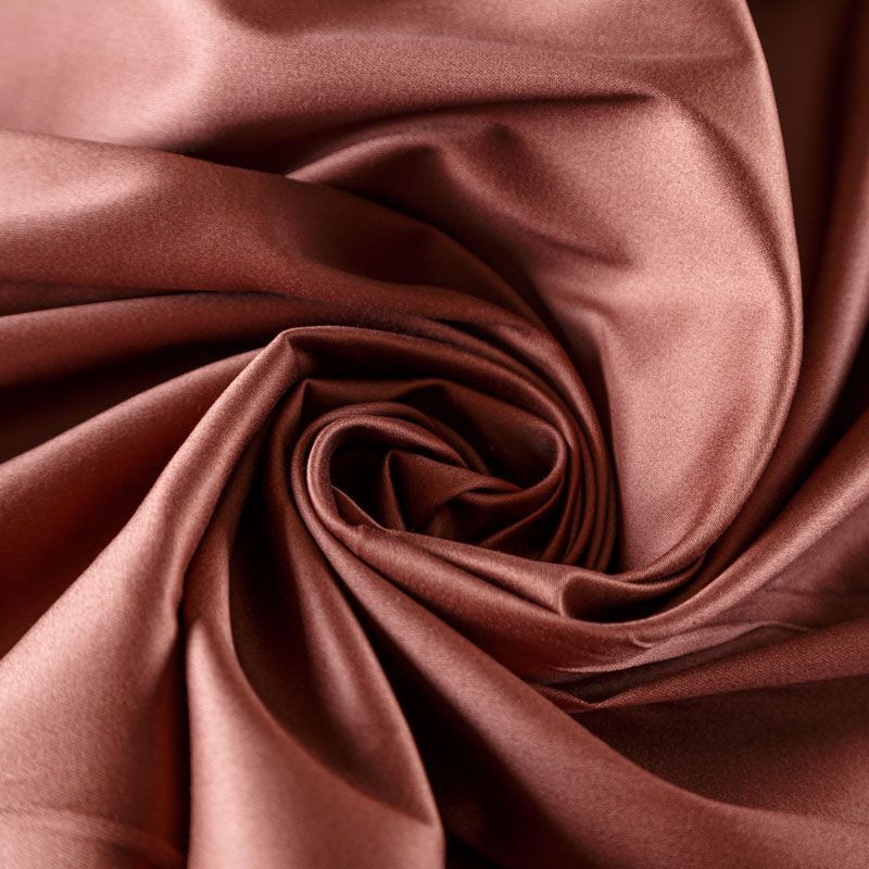 Сатин-коттон в коричневом оттенке, с гладкой поверхностью со сдержанным блеском, ткань средней плотности, не толстая, хорошо держит форму, тянется за счет эластана в составе. Подойдет для пошива костюма, жакета, юбки, платья, брюк или шорт.