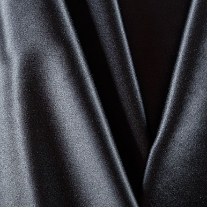 Сатин-коттон в черном цвете, с гладкой поверхностью со сдержанным блеском, ткань средней плотности, не толстая, хорошо держит форму, тянется за счет эластана в составе. Подойдет для пошива костюма, жакета, юбки, платья, брюк или шорт.