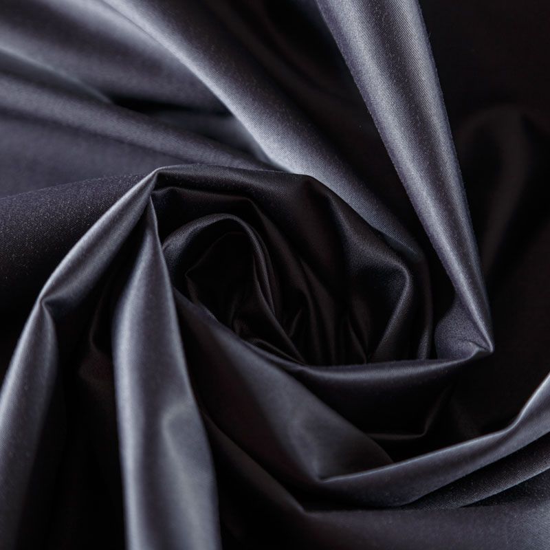 Сатин-коттон в черном цвете, с гладкой поверхностью со сдержанным блеском, ткань средней плотности,  не толстая, хорошо держит форму, тянется за счет эластана в составе. Подойдет для пошива костюма, жакета, юбки, платья, брюк или шорт.