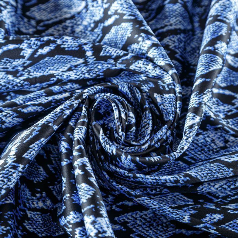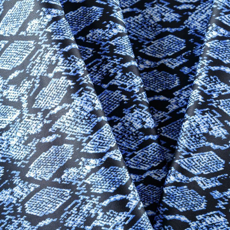 Сатин-коттон черного цвета со стилизованным анималистическим принтом, с гладкой поверхностью со сдержанным блеском, ткань средней плотности, не толстая, хорошо держит форму, тянется за счет эластана в составе. Подойдет для пошива костюма, жакета, юбки, платья, брюк или шорт.