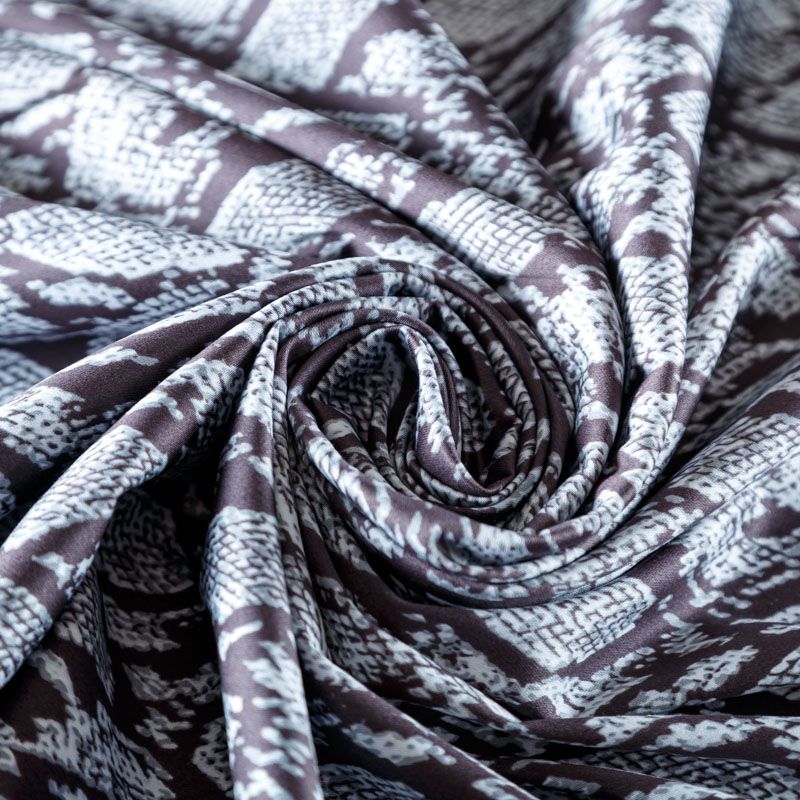 Сатин-коттон черного цвета со стилизованным анималистическим принтом, с гладкой поверхностью со сдержанным блеском, ткань средней плотности, не толстая, хорошо держит форму, тянется за счет эластана в составе. Подойдет для пошива костюма, жакета, юбки, платья, брюк или шорт.