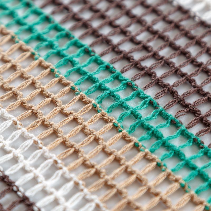 Вязаная сетка из натуральных хлопка в вертикальную цветную полоску.Форма ячейки - квадрат. Фактурный, пластичный материал, подходящий для создания эффектных образов: платья, юбки, брюк на подкладе, аксессуаров, сценических костюмов, пляжной одежды.