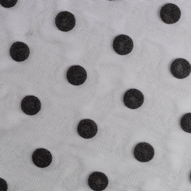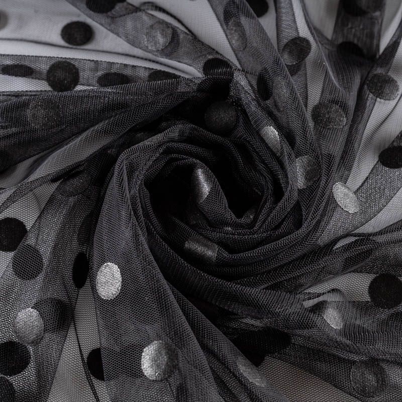 Тонкое, нежное, мягкое и прозрачное полотно, состоящее из мелких ячеек, на которых нанесен рельефный плетеный принт в виде гороха. Размер горошка - 1,5 см. Ткань красиво драпируется, тянется, применяется для декорирования деталей одежды, например, рукавов изделия, для пошива нарядной и повседневной одежды: топов, блузок, пышных юбок и платьев.