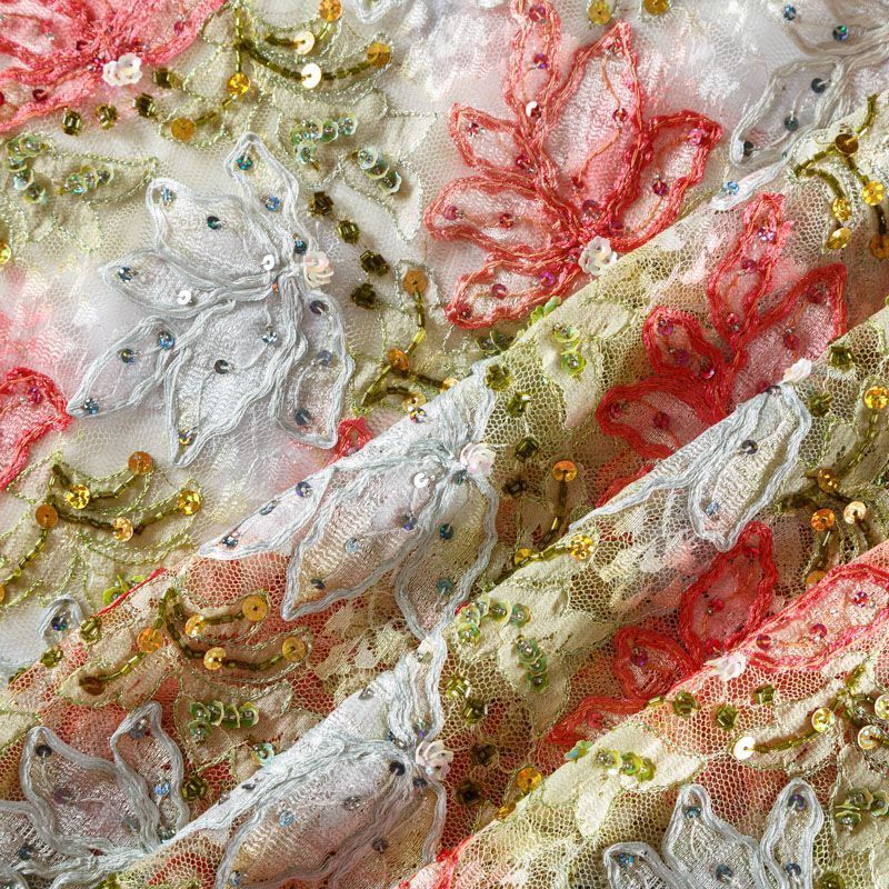 Итальянское полотно белого цвета с цветочным объемным узором, вышитом на тонкой сетке с мелкой ячейкой, сетка мягкая, пластичная, матовая, не держит форму. Дополнительно вышивка декорирована мелкими глянцевыми пайетками. Прекрасно подойдет для вечерних платьев, юбок, топов, бюстье. Эффектно смотрится на теле без подкладочной ткани, например, рукава платья.