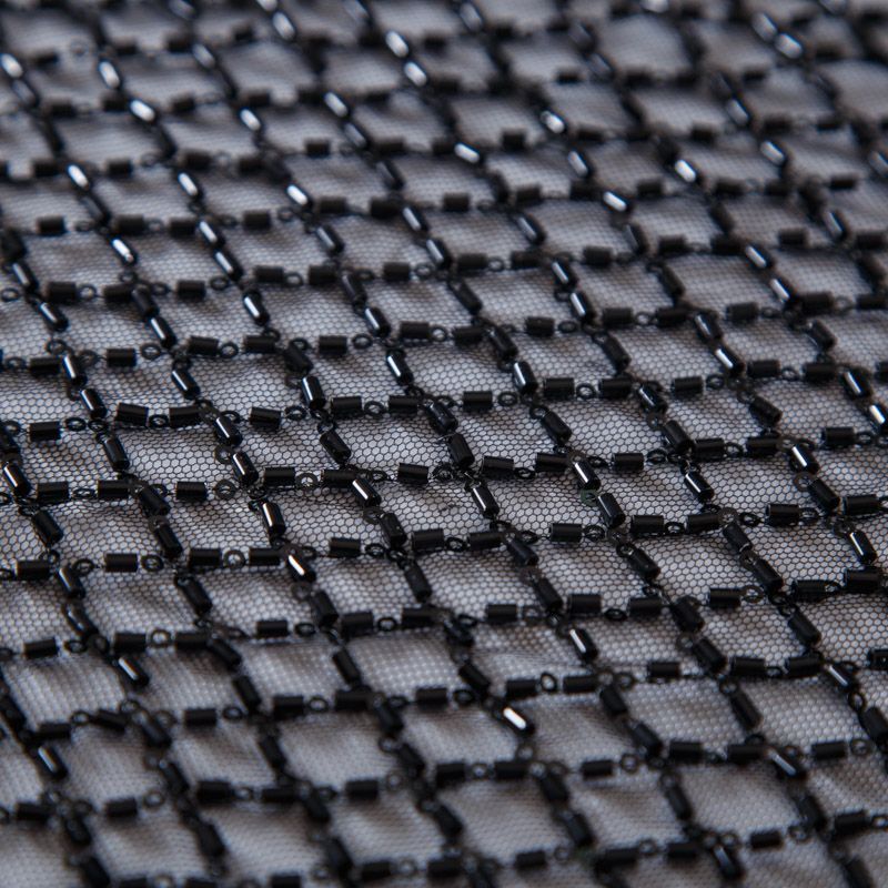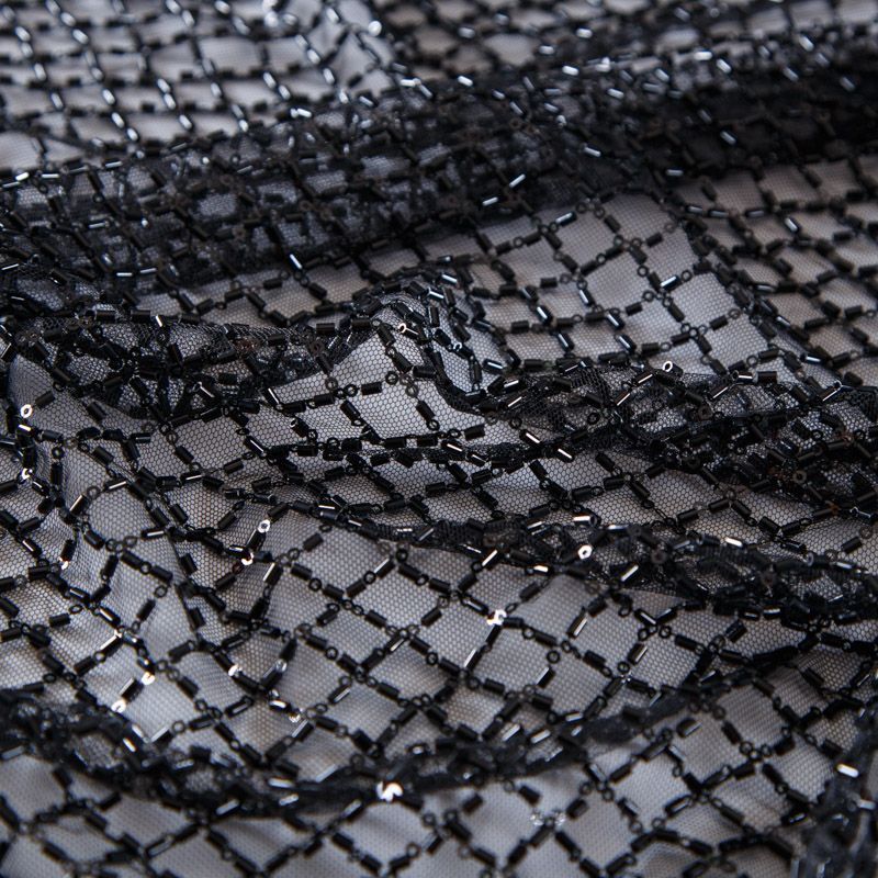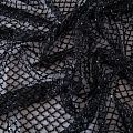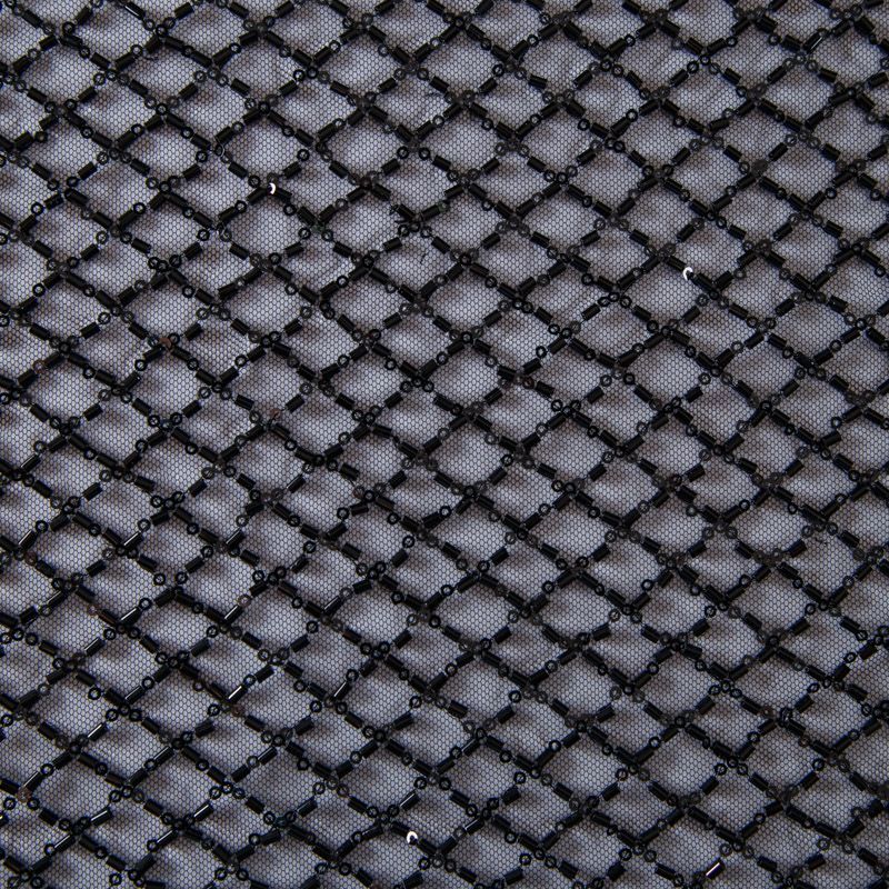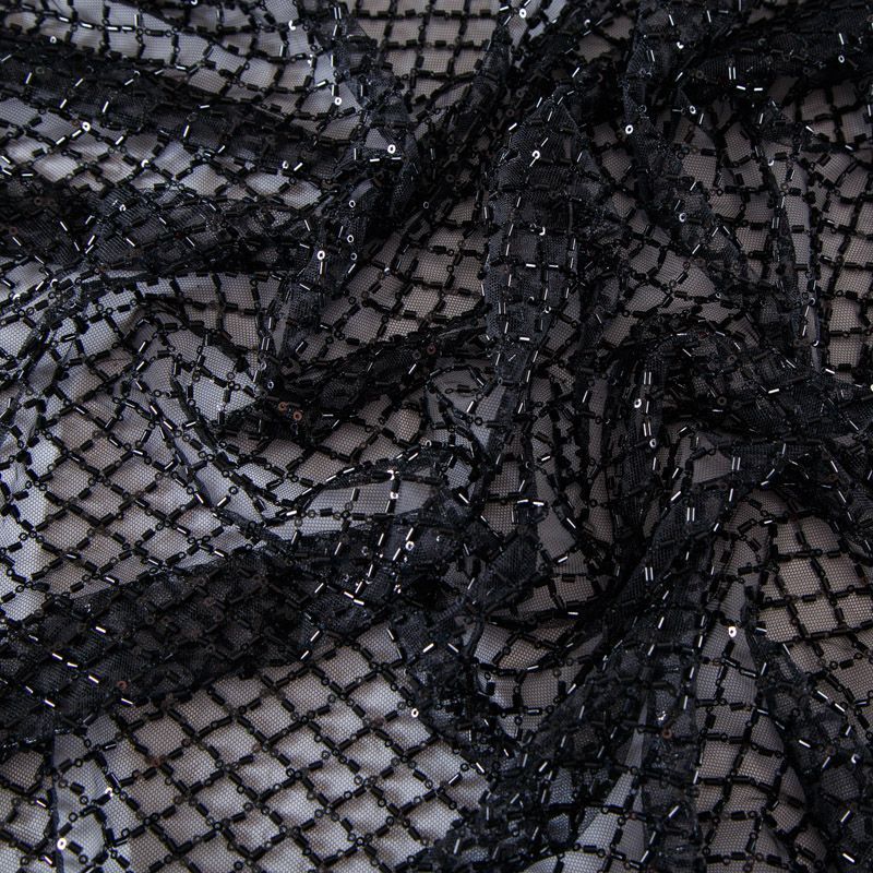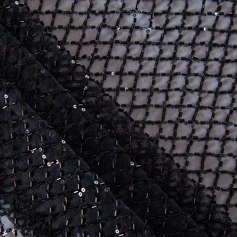 Эластичная мягкая сетка черного оттенка, расшитая стеклярусом и пайетками в тон основы. Геометрический дизайн делает полотно универсальным в использовании. Итальянская сетка прекрасно подходит для пошива праздничных нарядов, платьев, юбок и топов для торжественных случаев, а также отделки аксессуаров.