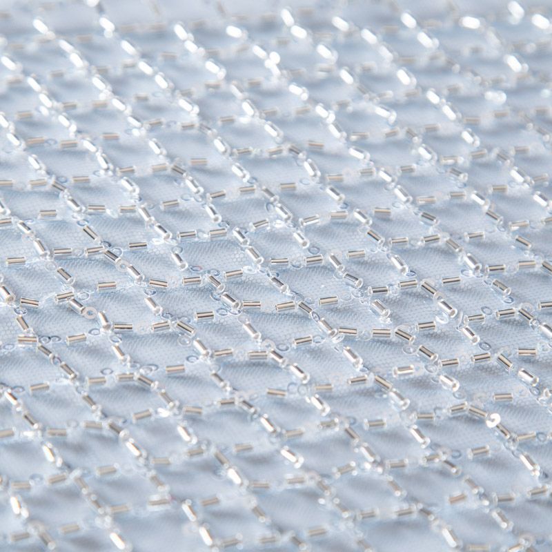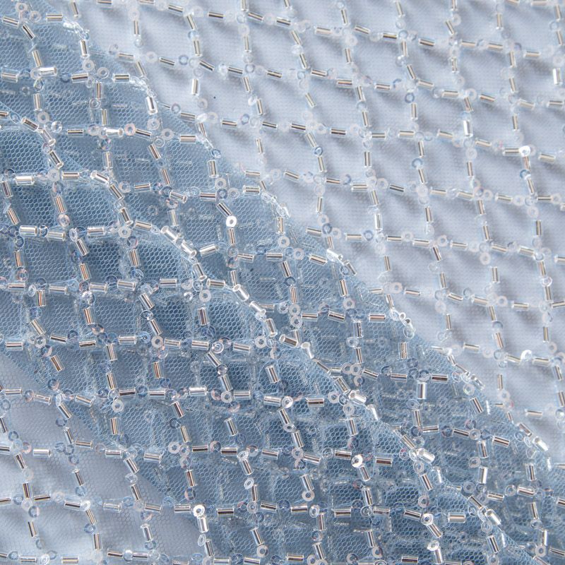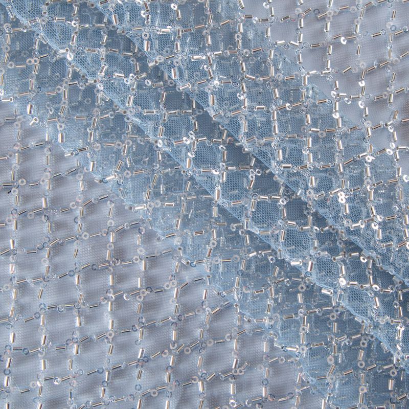 Эластичная мягкая сетка голубого оттенка, расшитая прозрачным стеклярусом. Геометрический дизайн делает полотно универсальным в использовании. Итальянская сетка прекрасно подходит для пошива праздничных нарядов, платьев, юбок и топов для торжественных случаев, а также отделки аксессуаров.