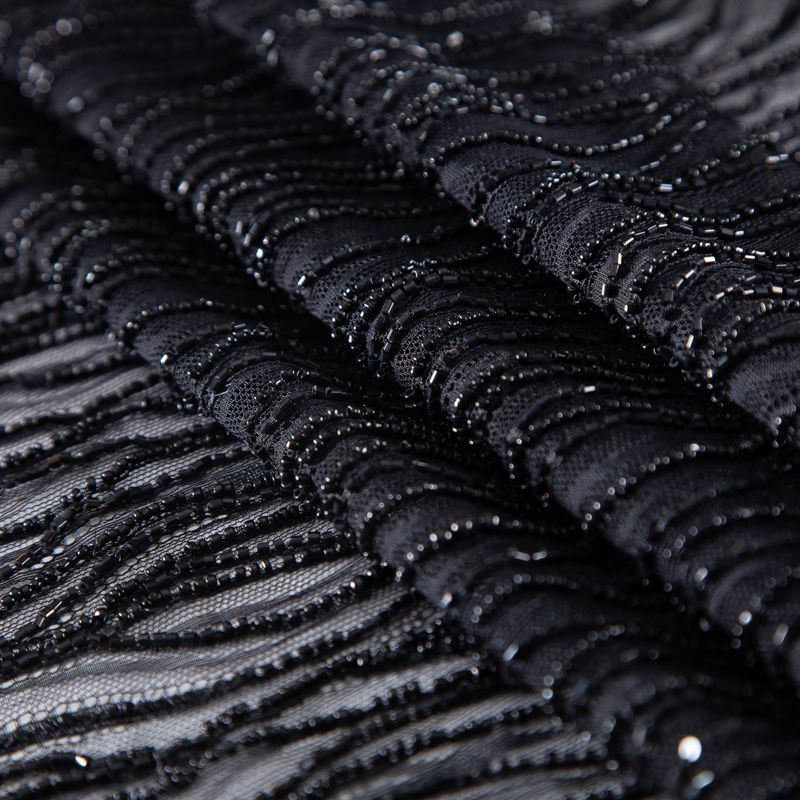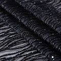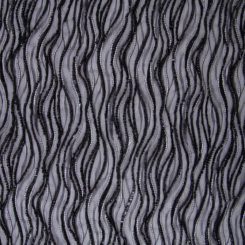 Нежнейшее итальянское кружево с насыщенной абстрактной вышивкой по всему полотну. Мерцание полотну придает нашитый стеклянный черный глянцевый бисер. Край полотна - фестон с "ресничками". Набирается на изделие объемом.