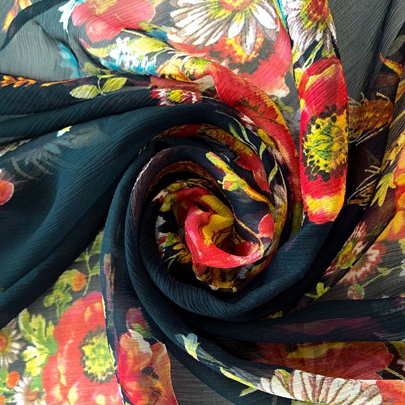 Шарф выполнен из шелкового шифона креш темно-синего оттенка с яркими букетами полевых цветов. Невесомый, воздушный, мягкий и пластичный, летящий, поверхность фактурная, жатая, с красивым матовым блеском. Будет отличным стильным аксессуаром к летнему платью, костюму, пальто.