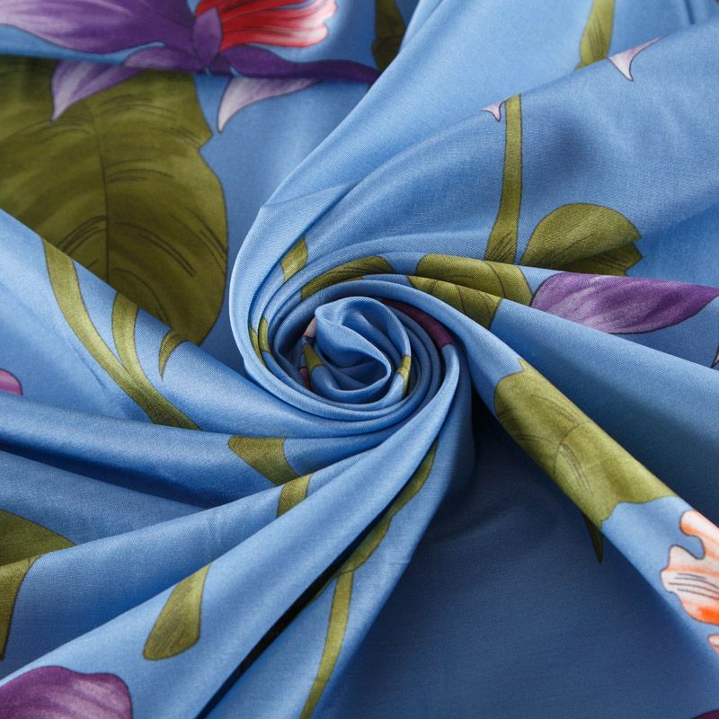 Итальянский шелк-батист в припыленном голубом оттенке с активным цветочным принтом. Ткань легкая, держит форму, отлично драпируется, поверхность шелковистая, матовая. Отличный вариант для пошива летнего гарбероба: платья, сарафана, рубашки, туники.