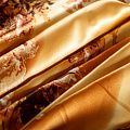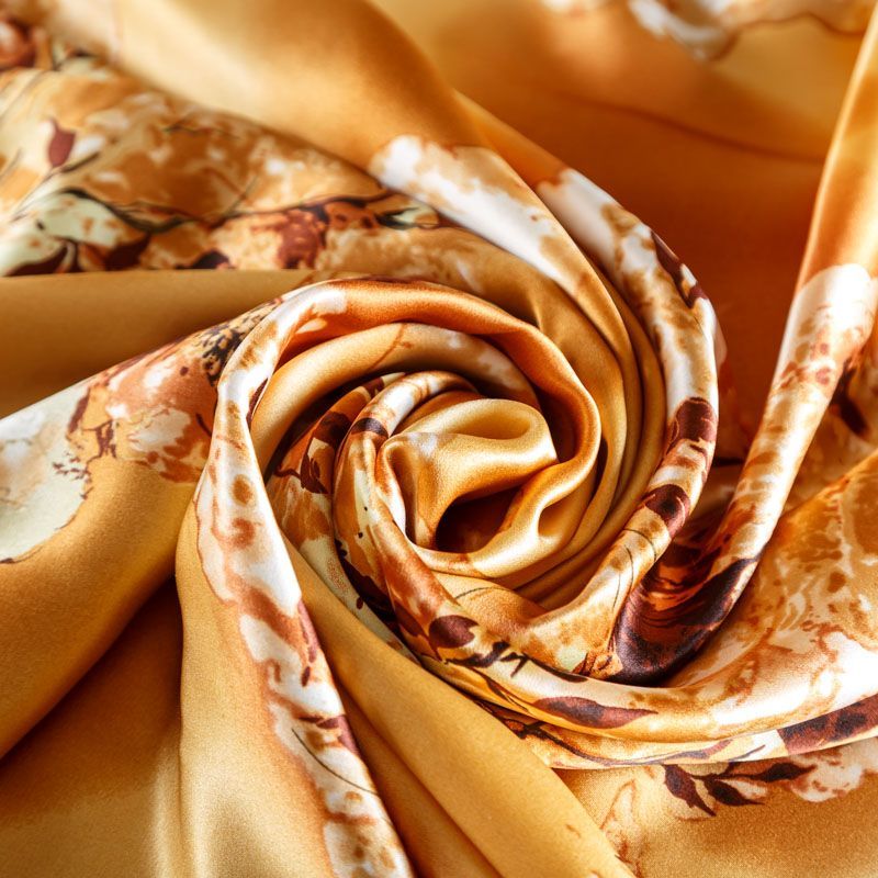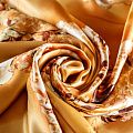 Итальянский атласный шелк с растительным принтом на золотисто-карамельном фоне. Ткань тонкая, не просвечивает, отлично драпируется, легкая и струящаяся. Идеально подойдет для пошива платьев и сарафанов расклешенных моделей, с воланами, летящих юбок, топов, блузки, костюма в пижамном стиле.